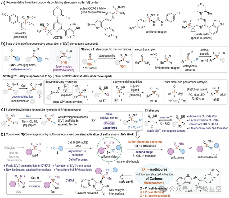 而这项研究的第一个 “神操作”,就是将异硫脲的催化能力 “跨界” 到 S (VI)原子上:通过与外消旋磺酰亚胺氯(S (VI)原料)形成异硫脲结合的磺酰亚胺中间体,实现了S (VI)原子的共价活化。