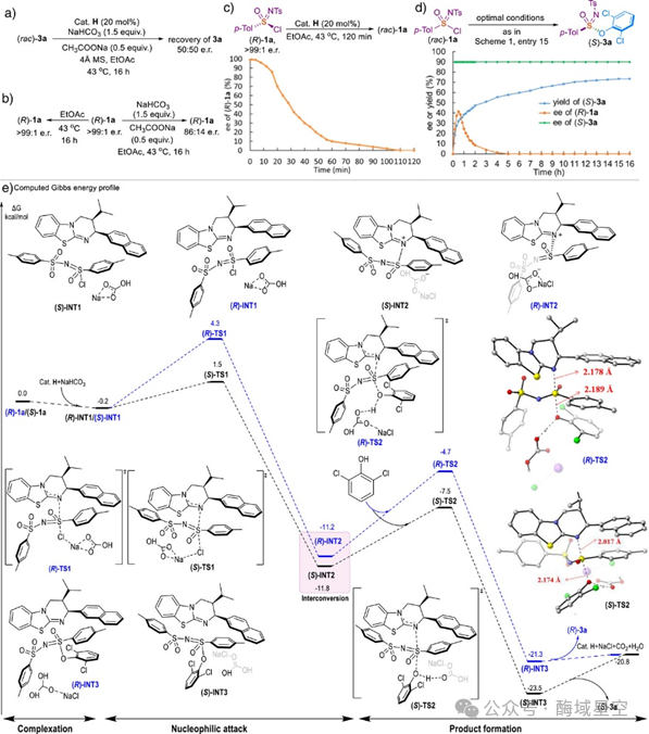 中间体形成:外消旋磺酰亚胺氯(1a)与异硫脲催化剂(Cat. H)、碳酸氢钠结合,形成复合物(INT1);催化剂对 S (VI)中心发起亲核进攻,氯离子离去,生成关键的异硫脲-磺酰亚胺中间体(INT2)—这一步得到了高分辨质谱(HRMS)的直接证实。