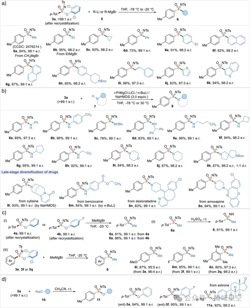 构型翻转与脱保护:通过简单的酚盐交换,还能实现 S (VI)中心的构型翻转(得到 ent-3a);而 N-Ts保护基的脱除,则能得到含 N-H键的磺肟(9),为后续功能化提供 “抓手”。
