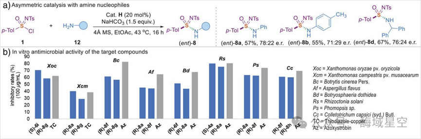 一项基础研究的终极价值,在于解决实际问题。吴兴兴团队并未止步于合成,而是进一步考察了这些 S (VI)手性化合物的农业抗菌活性—— 毕竟,植物病原菌(如细菌、真菌)是导致作物减产的主要原因,开发高效、低毒的新型农药迫在眉睫。作者选取了多种常见植物病原菌(如水稻白叶枯病菌 Xoc、番茄灰霉病菌 Bc、小麦纹枯病菌 Rs等),测试了化合物的抑制活性。结果令人惊喜:抗细菌活性:化合物6i对Xoc的抑制率高达70.8%,显著优于商用杀菌剂 TC(62.0%);抗真菌活性:化合物4a对Rs的抑制率达 80.2%,与商用杀菌剂嘧菌酯(azoxystrobin)相当;手性差异:研究还发现,手性构型对活性有显著影响——单一构型的化合物活性普遍优于外消旋体,这也凸显了“手性控制”在农药研发中的重要性。这些结果表明,该方法合成的S (VI)手性化合物,有望成为新型绿色农药的 “候选分子”,为农业病害防治提供新策略。