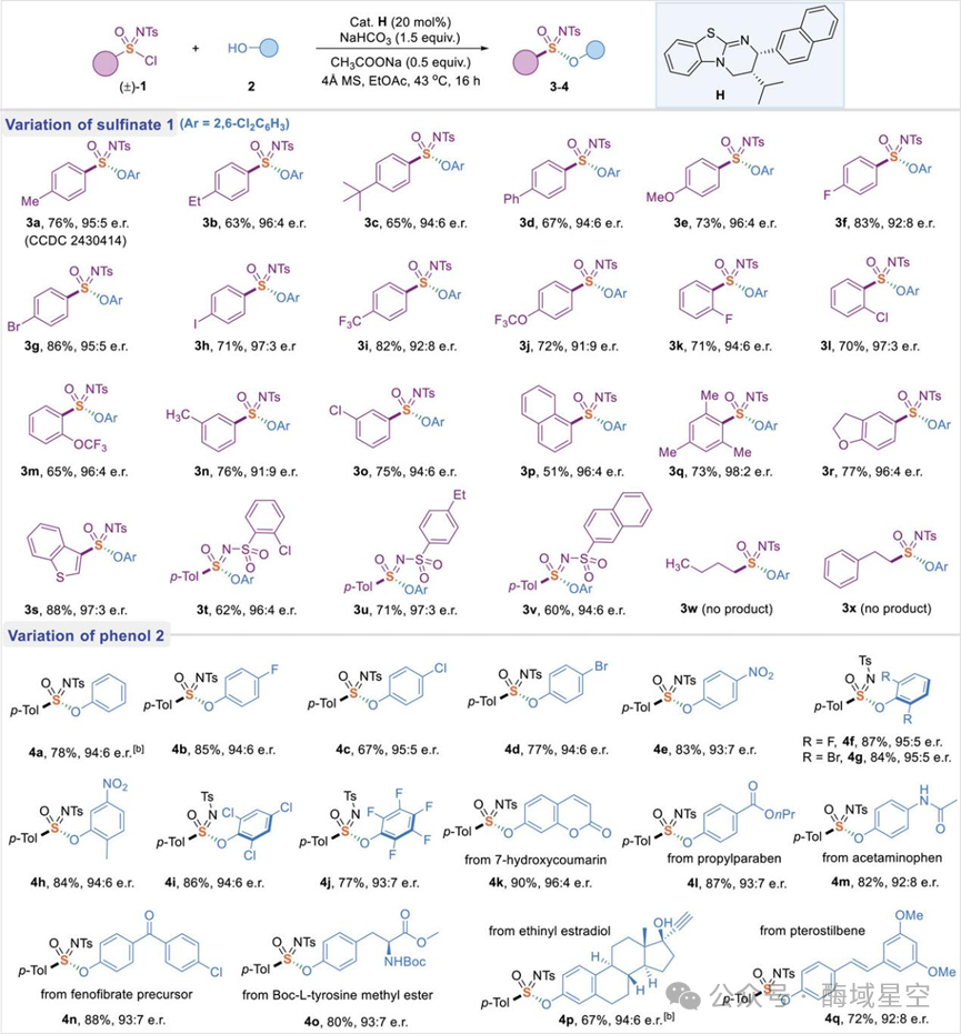 这个中间体有多关键?它不仅降低了 S (VI)中心的反应能垒,还为后续的不对称反应搭建了 “手性模板”—— 当酚类亲核试剂进攻时,中间体的手性环境能精准控制 S-O键的形成,最终以高达 97:3的对映选择性和 86%的产率得到 S (VI)手性磺酰亚胺酯。