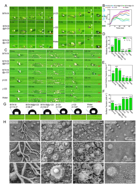 BiTA18@β-CD/γ-CD可在水稻微晶基质表面自组装形成纳米级六方柱状结构,实现药液的高效叶片滞留与沉积 杀菌剂发挥功效的关键前提是其在叶面喷施后能够稳定附着于靶标植物表面。鉴于所构建超分子体系具有优异的生物相容性,我们开展了一系列实验,系统考察其在疏水性叶片表面的润湿性、附着性及沉积行为。首先,借助高速摄像机记录药滴动态行为,评估其在水稻叶片上的铺展与反弹性能。如图2A及支撑材料视频S1所示,对照组药滴(H₂O、β-CD或γ-CD)在水稻叶片上表现出明显的反弹现象,而BiTA18@β-CD和BiTA18@γ-CD超分子体系能显著抑制药滴反弹,其效果明显优于单一BiTA18分子。进一步对药滴反弹高度进行归一化处理(Ht/D₀,其中Ht为最大反弹高度,D₀为初始液滴直径,见图2B)。数据显示,当药滴达到最大反弹高度时,各体系的归一化高度分别为:BiTA18(2.08)、BiTA18@β-CD(1.34)、BiTA18@γ-CD(1.38)、β-CD(2.37)、γ-CD(2.86)及H₂O(2.78)。这一结果表明,具有生物相容性的BiTA18@β-CD和BiTA18@γ-CD药滴能显著增强与水稻蜡质层基质的亲和力。此外,药滴飞溅与分裂行为作为影响农药利用率的关键因素,本研究也对其进行了深入考察。如图2C及支撑材料视频S2所示,在高速冲击条件下,经BiTA18@β-CD和BiTA18@γ-CD处理的液滴仅有少量发生飞溅分离,绝大多数药滴最终稳定附着于叶片表面。定量分析显示,BiTA18@β-CD和BiTA18@γ-CD的最终滞留率分别达到70.2%和62.5%,显著高于BiTA18组及其他对照组(图2D)。这一结果表明,该超分子体系能有效抑制药滴飞溅,促使大部分药液沉积于目标作物表面,从而显著提升农药利用率。