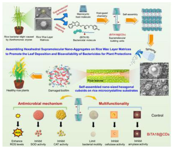 研究思路:植物表面天然存在的疏水性蜡质层微结构会严重阻碍农药液滴的叶片附着与沉积,导致农药生物利用度低下,并引发难以避免的环境污染。受超分子自组装策略启发,本研究基于苯并咪唑修饰杀菌分子(BiTA18)与β-/γ-环糊精(β-CD/γ-CD)的主客体复合,设计合成两种各向异性超分子构筑单元(BiTA18@β-CD和BiTA18@γ-CD)。这些构筑单元能在水稻微晶基质表面自组装形成纳米级六方柱状结构,显著提升杀菌成分在靶标植物上的滞留量。更引人注目的是,这类寡糖包覆的超分子材料凭借优异的生物相容性,可突破细菌生物膜屏障,抑制细菌运动能力及胞外酶分泌,并诱导细菌电解质泄漏与活性氧积累,最终实现对顽固病原菌的彻底杀灭。综合这些优势,最优超分子材料BiTA18@β-CD在200 µg/mL浓度下对水稻白叶枯病和柑橘溃疡病的防治效率分别达到54.4%和71.7%,显著优于春雷霉素(34.3%/34.1%)、噻唑锌-20%SC(39.9%/42.7%)和BiTA18原药(42.7%/46.9%)。此外,该超分子体系对蚯蚓和斑马鱼等非靶标生物表现出良好安全性。本研究为构建基于水稻微晶基底的超分子构筑单元提供了关键思路,对提升农药利用率具有重要启示意义。