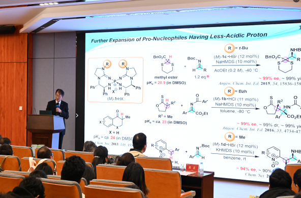 本次论坛汇聚了国际知名学者,带来了一系列高水平学术报告。南洋理工大学Loh Teck-Peng 院士以《Green and Biocompatible Technologies: From Discovery to Translation and Beyond》为题,分享了该领域的最新研究进展;东北大学理学研究科Masahiro Terada 教授围绕《Enantioselective Catalysis by Higher OrderOrganosuperbase》展开深入讲解;名古屋大学Kazuaki Ishihara教授以《Rational Design of High-Performance Catalysis Based on Acid–Base Combination Chemistry》为主题,展示了创新研究成果;布鲁克海文国家实验室Guobin Hu 教授通过线上方式,作了题为《A Joint Endeavor of Cryo-EM and Cryo-ET: Sub-cellular Dynamics and Protein》的精彩报告。