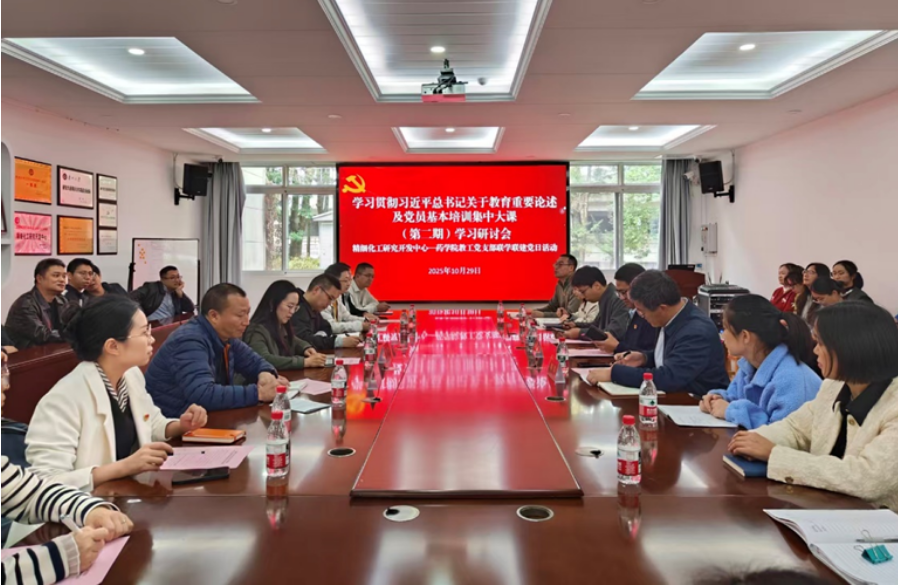 2025年10月28日,贵州大学药学院与精细化工研究开发中心、绿色农药全国重点实验室教工党支部共同举办“联学联建促发展”主题党日活动。本次活动创新采用“理论学习+实地参观+研讨交流”三位一体模式,紧扣教育强国建设目标,深入学习习近平总书记关于教育的重要论述,强化党员教育培训实效,推动两单位党组织优势互补、协同发展。中心教工党支部副书记张维同志主持学习交流研讨会。