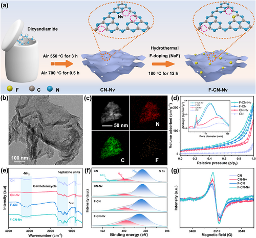 针对水净化过程中碳源流失与CO2无序排放的难题,本研究通过将亲氢氟元素引入富氮空位氮化碳(F-CN-Nv),成功设计出电荷不对称的无金属双功能光催化体系。该体系实现了草甘膦废水完全降解并原位升级为一氧化碳(788 µmol gcat−1 h−1),产物选择性超99%。原位光谱与理论计算表明:氟物种通过氢键作用特异性锚定草甘膦的-H2PO3基团,定向吸附促进C–P键断裂,确保CO专一性生成。氮空位与氟位点的协同作用调控F-CN-Nv的电子构型与表面极化,形成电荷不对称表面增强O2在氮空位处的吸附。同时,氮空位介导的n-π*电子跃迁加速界面电荷转移,通过多电子还原路径选择性生成•OH自由基,显著提升光催化降解效率。毒性评估软件分析证实,F-CN-Nv对C─P键的选择性断裂有效降低了草甘膦及其降解中间体的急性和发育毒性。本研究为充分利用光催化体系的氧化还原潜能实现废水高效净化与定向资源化提供了创新性解决方案。