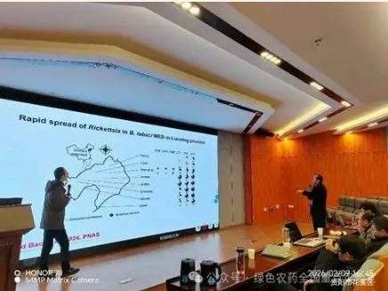 2026年2月9日,沈阳农业大学植物保护学院院长栾军波教授应邀莅临贵州大学精细化工研究开发中心(绿色农药全国重点实验室),为师生做了题为“共生菌调控烟粉虱生殖的分子机制”高水平学术报告。聚焦共生菌与昆虫宿主互作这一国际热点,栾教授系统梳理了该领域的最新进展,并深入浅出介绍了其团队在烟粉虱-共生菌互作相关机制研究中取得的关键突破:烟粉虱体内共生菌通过多层次分子机制调控其生殖过程与种群性别比例,系统阐述了Hamiltonella、Arsenophonus及Rickettsia三类共生菌分别通过营养供给、表观遗传调控和激素信号通路等途径,显著影响烟粉虱的繁殖力与后代性别。