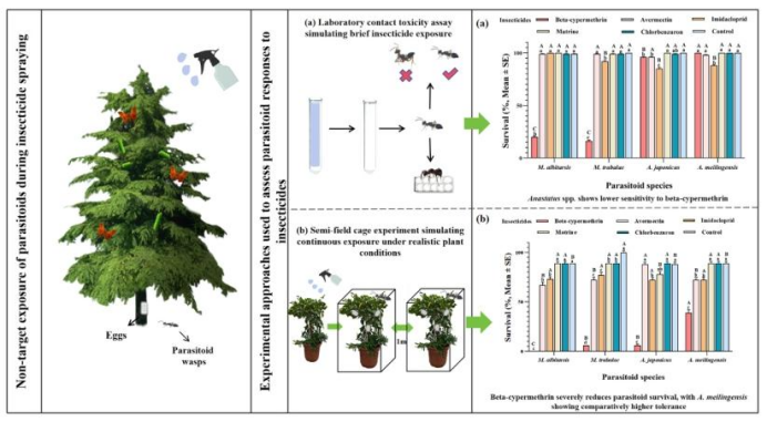“Differential chemical hazards of common insecticides to Eupelmidae parasitoids: An ecological risk assessment for integrated pest management in forest ecosystems”文章发表在《Journal of Hazardous Materials》。本研究发现旋小蜂科的Anastatus和Mesocomys属寄生蜂对杀虫剂耐受性存在显著属间差异,Anastatus属(尤其梅岭卵跳小蜂)对拟除虫菊酯类杀虫剂具有天然高抗性,而Mesocomys属则高度敏感;苦参碱和灭幼脲对所有受试寄生蜂生存、繁殖影响极小,可作为森林生态系统综合虫害管理的优选选择性杀虫剂,为兼顾化学控害与寄生蜂保护的可持续森林管理提供了科学依据。