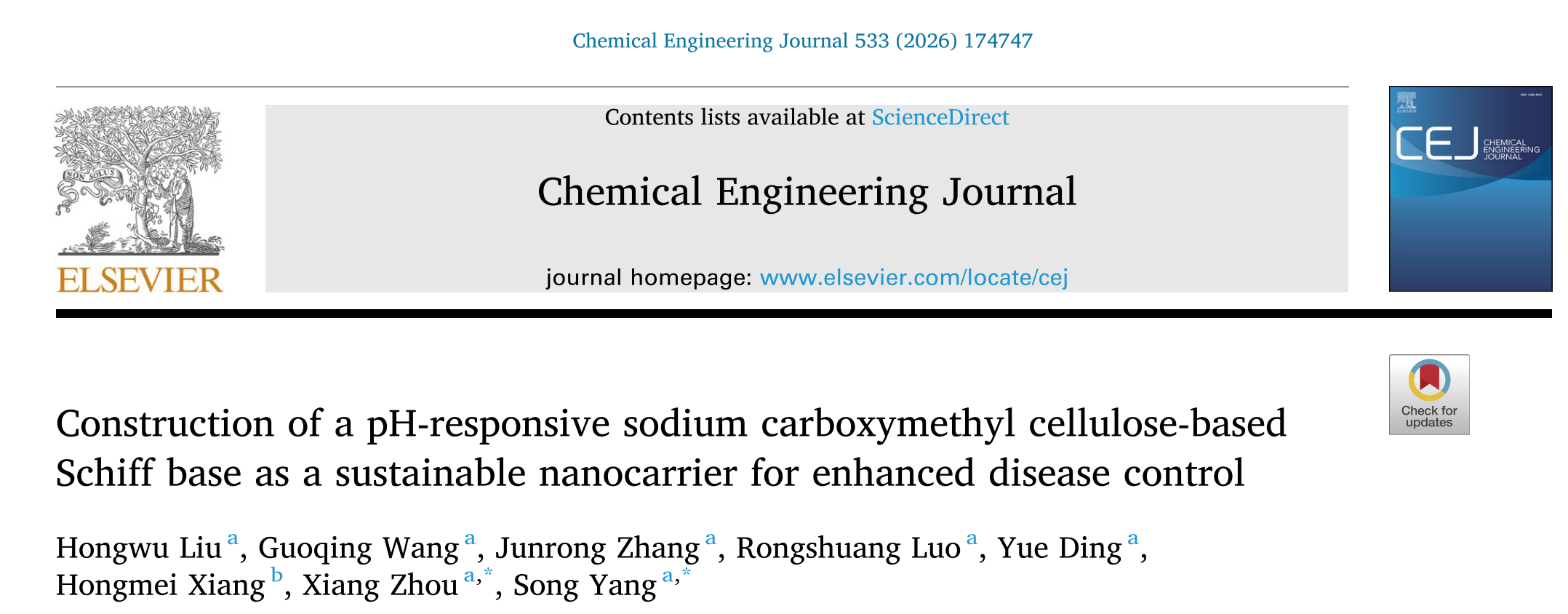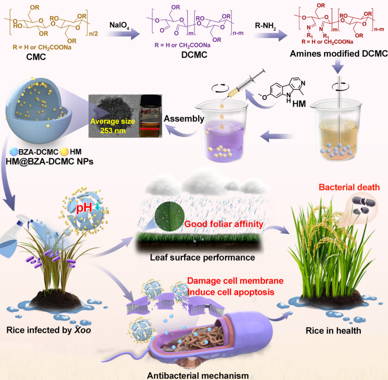 基于此,贵州大学的杨松教授与周翔教授团队在《Chemical Engineering Journal》发表了一项研究,团队将 CMC 氧化为双醛 CMC(DCMC),与疏水性苄胺构建席夫碱结构,赋予载体自组装、pH 响应、叶面高黏附三大功能,以此包载 HM,实现 “靶向释药 + 稳附叶面 + 激活免疫 + 生态安全” 一体化的绿色纳米农药。