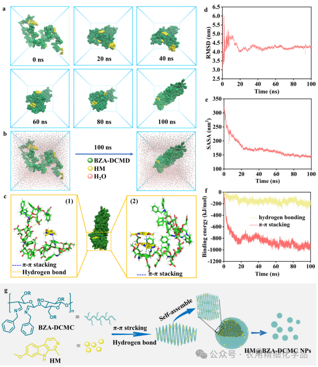 分子间作用力:结合能计算揭示,π-π堆叠作用 (-828.65 ± 136.23 kJ/mol) 和氢键作用 (-149.34 ± 45.93 kJ/mol) 是驱动纳米颗粒聚集的主要分子间作用力 。HM分子通过 π-π 相互作用堆叠在BZA-DCMC的疏水空腔内,从而大幅提升了其水溶性 。