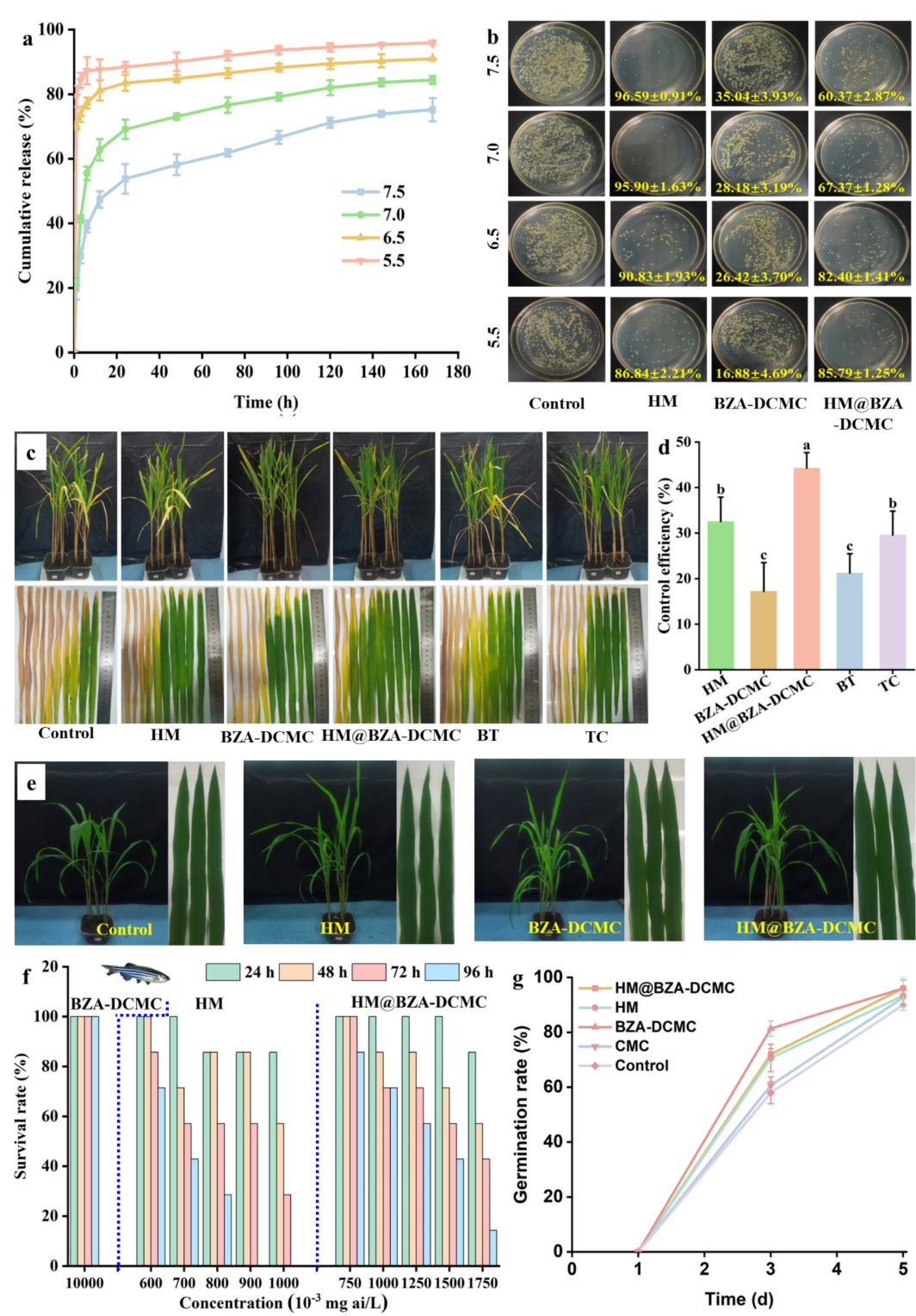 图. HM@BZA-DCMC的释放动力学、生物有效性和安全性。(A)在磷酸盐缓冲盐水中的pH依赖释放曲线。(B)在不同pH值(HM浓度:10μg/mL)下对Xoo的体外抑菌活性。(C)施药后14d(HM浓度:200μg/mL)对水稻白叶枯病的体内防治效果。以市售杀菌剂Bt和TC为阳性对照。(D)治疗后14d的疾病控制效果。不同的字母表示有统计学意义的差异(Tukey‘s HSD检验,p<;0.05)。(E)对水稻植株的植物毒性评估。(F)斑马鱼毒性评价。(G)5d以上对水稻种子萌发的影响。