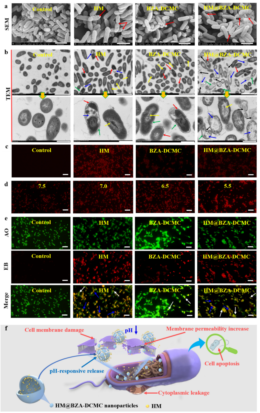 杀菌机制:电镜 (SEM/TEM) 及荧光染色分析证实,HM@BZA-DCMC能造成病原菌细胞膜严重破裂、细胞质泄漏,并诱发细菌细胞凋亡