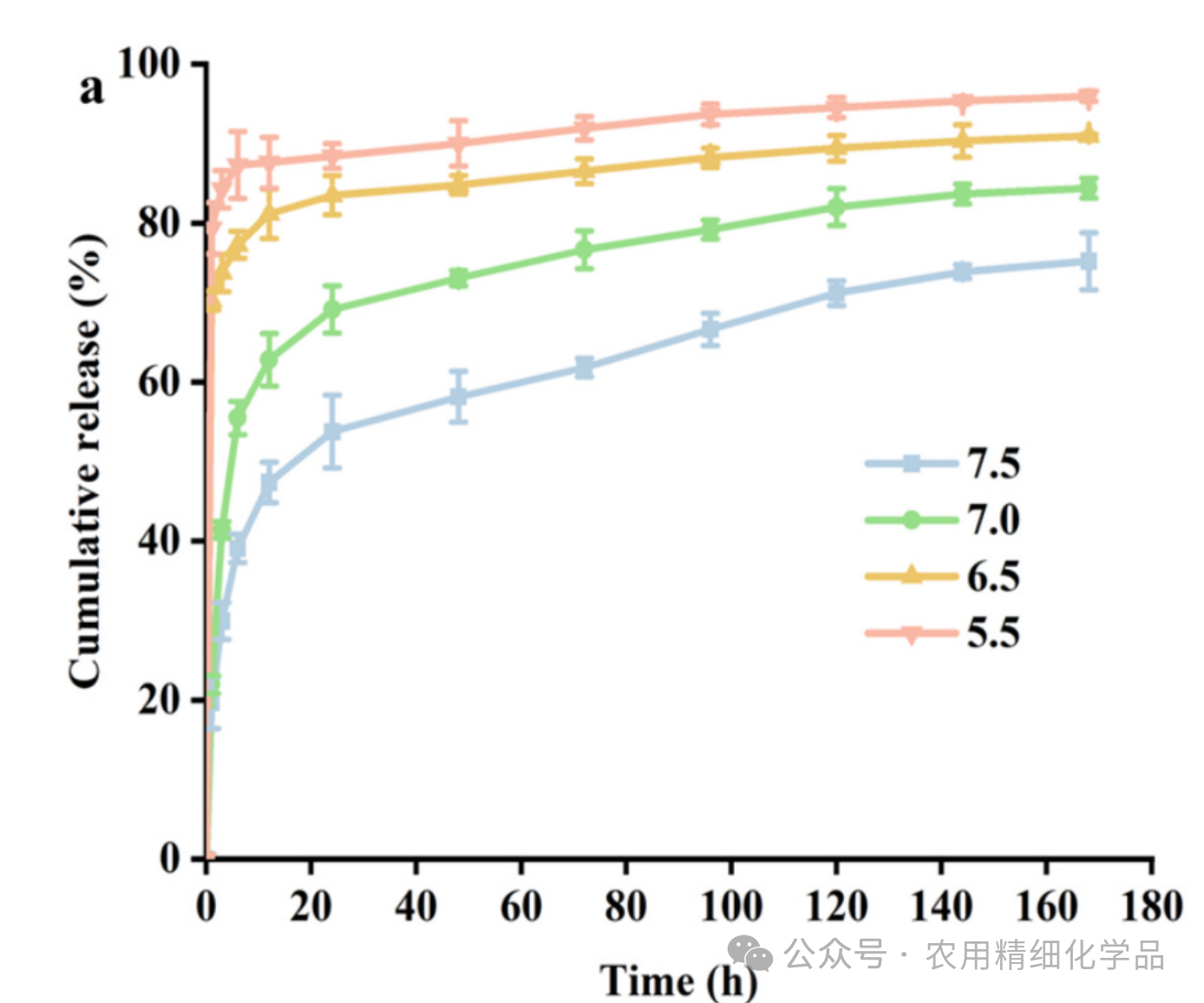 动力学模型分析表明,该释放过程更符合Korsmeyer-Peppas模型,主要受Fickian扩散机制主导 。这种特性使得农药能够在病害发生的酸性微环境中实现按需释放 。