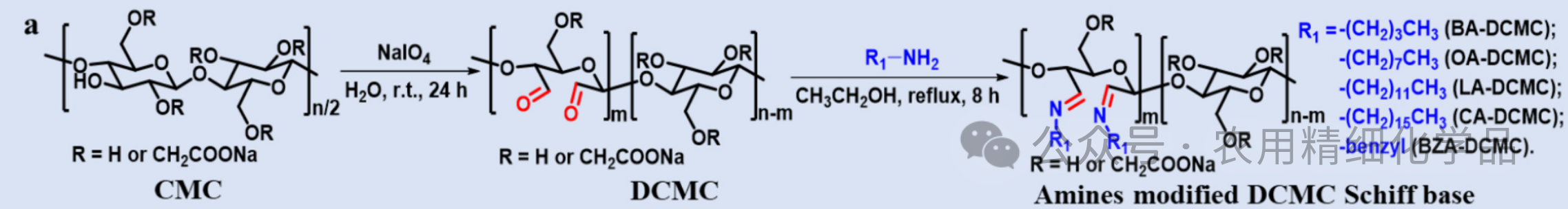 羧甲基纤维素钠(CMC)来源广泛、可生物降解、生物相容性优异,是理想的农用高分子载体,但未改性 CMC 缺乏刺激响应能力与自组装成纳米结构的能力。席夫碱(–C=N–)具有典型酸敏感特性,可在病原菌侵染形成的弱酸性微环境(pH 5.5–6.5) 中断裂释放活性物质,为精准控释提供了化学基础。