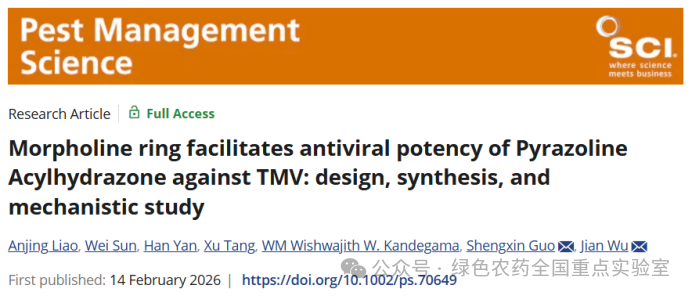 “Morpholine ring facilitates antiviral potency of Pyrazoline Acylhydrazone against TMV: design, synthesis, and mechanistic study”文章发表在《Pest Management Science》。本研究合成了无吗啉环的吡唑啉酰腙衍生物A系列(A-1~A-18)和含吗啉环的T系列(T-1~T-27),证实吗啉环的引入可显著提升衍生物抗烟草花叶病毒(TMV)活性,其中化合物T-19的治疗活性(80.9%)和灭活活性(90.5%)优于或媲美商用宁南霉素;吗啉环通过实现分子前线轨道空间分离、增强与TMV外壳蛋白(TMV-CP)结合亲和力等机制提升抗病毒效能,为新型植物抗病毒剂设计提供了吗啉环融合的创新策略。
