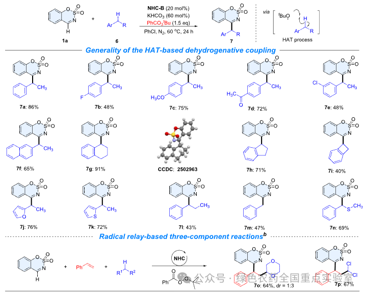 基于核心体系,团队进一步开发出 NHC 催化的亚胺与烷烃交叉脱氢偶联反应,以过氧化苯甲酸叔丁酯为氧化剂兼氢原子提取试剂,实现从廉价烷基苯直接构建酮亚胺骨架,产物收率最高 86%,且兼容呋喃、噻吩等杂环底物,进一步提升了该方法的合成价值。
