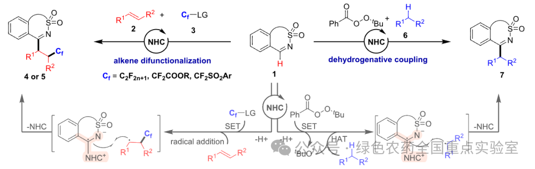 氮杂环卡宾(NHC)催化是合成复杂功能分子的核心工具,此前研究多聚焦羰基化合物的自由基活化来制备酮类,而亚胺的 NHC 催化自由基活化因难以实现可控单电子氧化,长期处于未攻克状态。贵州大学任世超教授团队近期在《ACS Catalysis》发表重磅成果,首次实现 NHC 催化亚胺的单电子氧化与烷基化,开发出烯烃双官能化和脱氢偶联两条全新反应路径,为环状 N-磺酰基酮亚胺合成开辟新方向。