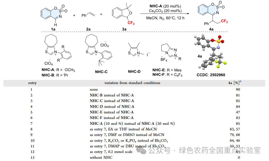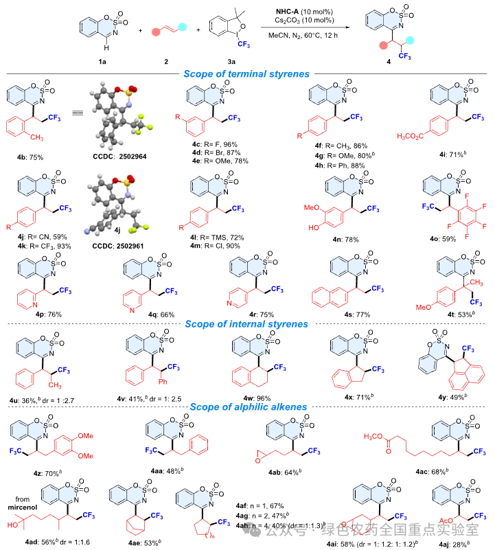 经系列条件优化,团队确定最优催化体系:以噻唑鎓盐 NHC-A 为预催化剂、Cs₂CO₃为碱、乙腈为溶剂,60℃氮气氛围下反应,目标产物收率达 90%。该体系展现出优异的底物普适性,取代苯乙烯、脂肪族烯烃,六元 / 五元环状 N-磺酰基亚胺均能高效反应,对羟基、氰基、酯基等官能团耐受性良好;同时多种氟代试剂的应用,可实现产物氟代修饰,进一步丰富结构多样性。