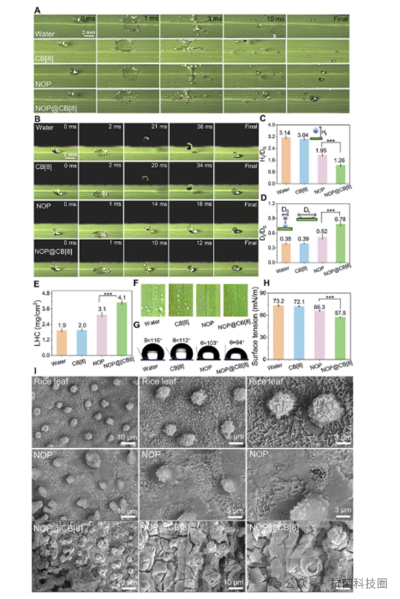 图5:NOP 及其超分子聚合物 NOP@CB[8] 在水稻叶片表面的叶面亲和力。(A、B)从 30 厘米高度滴落形成的液滴高速成像(A)以及从 15 厘米高度反弹的成像(B)。(C)液滴的最大反弹高度,以归一化比率 Ht /D0 表示,源自 Movie S2。(D)液滴相对于其最终铺展状态的归一化铺展直径(Dt /D0),源自 Movie S2。(E)水稻叶片在水、CB[8]、NOP 和 NOP@CB[8] 溶液(200 µg mL− 1)中浸入后的液体持留能力。(F)水、CB[8]、NOP 和 NOP@CB[8] 溶液(200 µg mL− 1)的润湿和铺展行为的可视化观察。(G)水、CB[8]、NOP 和 NOP@CB[8] 溶液(200 µg mL− 1)的接触角。(H)水、CB[8]、NOP 和 NOP@CB[8] 溶液(200 µg mL− 1)的表面张力。(I)显示 NOP 和 NOP@CB[8] 与水稻叶片表面附着情况的扫描电子显微镜图像。NOP 的浓度在自由分子和 NOP@CB[8] 中均为 200 µg mL− 1,后者在 NOP 与 CB[8] 的摩尔比为 1:1 的条件下制备。数据以平均值±标准差(n ≥ 3)的形式呈现。统计学意义通过单因素方差分析得出,并随后进行了 LSD 后置检验(*p < 0.05,**p < 0.01,***p < 0.001;ns,无显著差异)。