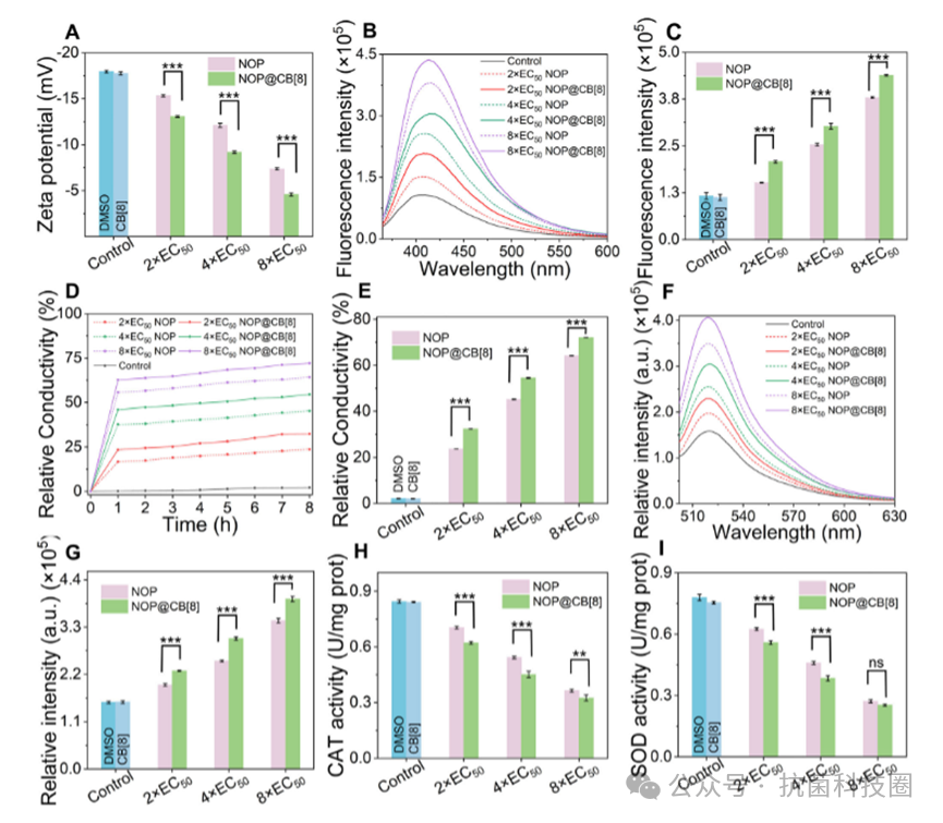 图2:NOP 及其超分子聚合物 NOP@CB[8] 的拟议抗菌机制。(A)不同浓度(0、2×EC50、4×EC50、8×EC50)的 NOP 和 NOP@CB[8] 处理后的 Xoo 细胞的 Zeta 电位。(B)使用 NPN 探针在处理 30 分钟后检测到的 Xoo 外膜通透性的荧光强度曲线(λEx = 350 纳米)。(C)对应于(B)中 NPN 吸收的 415 纳米处的荧光强度定量。(D)不同浓度(0、2×EC50、4×EC50、8×EC50)的 NOP 和 NOP@CB[8] 处理后的 Xoo 悬浮液的相对电导率。(E)从(D)得出的 8 小时后相对电导率的定量值。(F)在不同浓度(0、2×EC50、4×EC50、8×EC50)的 NOP 和 NOP@CB[8] 与 Xoo 共孵育后通过 ROS 试剂盒检测到的 Xoo 内部活性氧(ROS)积累(λEx = 488 纳米)。(G)反映 ROS 水平的 520 纳米处的荧光强度定量。(H、I)在不同浓度的 NOP 和 NOP@CB[8] 处理后 Xoo 中的过氧化氢酶(CAT)和超氧化物歧化酶(SOD)活性。数据以平均值±标准差(n≥3)的形式呈现。统计学意义通过单因素方差分析得出,并随后进行了 LSD 后置检验(*p < 0.05,**p < 0.01,***p < 0.001;ns,无显著差异)。