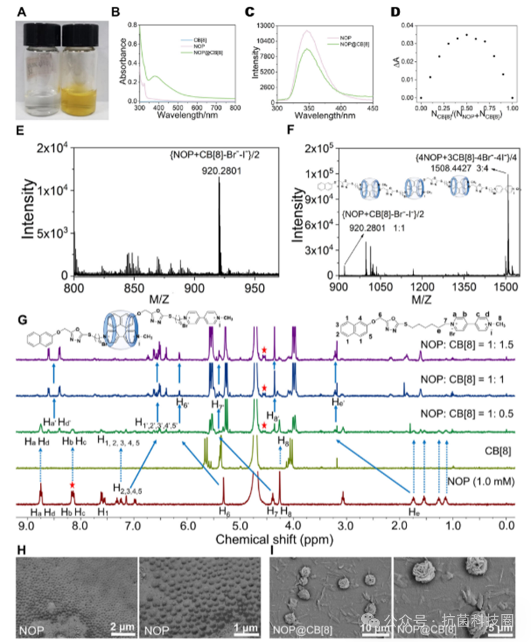 图1 :超分子聚合物 NOP@CB[8] 的表征。(A)NOP(左图)和 NOP@CB[8](右图)在水溶液中的照片。(B)NOP、CB[8] 及其 1:1 混合物(每种 0.15 毫摩尔)在水溶液中的紫外-可见吸收光谱。(C)NOP 和 NOP@CB[8](每种 0.25 毫摩尔)在水溶液中的荧光发射光谱,激发波长为 290 纳米。(D)在水中 NOP 和 CB[8] 总浓度为 0.1 毫摩尔时获得的 350 纳米处的 Job 图。(E、F)NOP@CB[8] 的 MALDI-TOF-MS 光谱。(G)NOP(1.0 毫摩尔)、CB[8] 及其摩尔比为 1:0.5、1:1 和 1:1.5 的混合物的 1H NMR 光谱(400 MHz,D2 O,298 K)。(H、I)NOP(H)和 NOP@CB[8](I)的 SEM 图像。