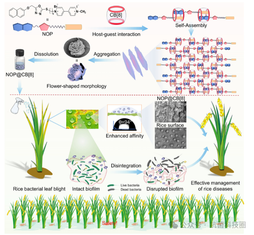 本研究首次报道了一种基于主客体识别自组装的超分子聚合物NOP@CB[8],并将其成功应用于植物细菌性病害的防控。该聚合物由作者自主设计的功能分子NOP与葫芦[8]脲在水相中自组装而成,形成具有花状形貌的超分子结构。NOP@CB[8]不仅保留了NOP本征的抗菌活性,还通过CB[8]的引入显著增强了其对细菌细胞膜的破坏能力和抗氧化系统的干扰作用,表现出优于单体的杀菌效果。更重要的是,该聚合物在生物膜形成的多个关键环节——包括胞外多糖合成、胞外酶活性、细菌运动能力等方面均表现出显著的抑制作用,具备抑制和清除成熟生物膜的双重功能。