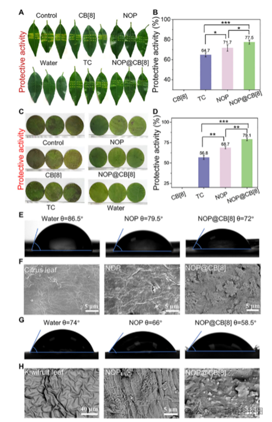 图 7: NOP 及其超分子聚合物 NOP@CB[8] 对柑橘和猕猴桃溃疡病的体内疗效,以及它们在相应叶片上的叶面亲和性。(A)应用 NOP、NOP@CB[8] 和商业杀菌剂 TC(200 µg ⋅mL− 1 )处理柑橘叶片 14 天后,连续培养期间病害症状的代表性图像。(B)基于(A)中所示的病变严重程度对每种处理的保护效果进行定量。(C)应用 NOP、NOP@CB[8] 和 TC(200 µg ⋅mL− 1 )处理猕猴桃叶片 14 天后,连续培养期间病害症状的代表性图像。(D)从(C)中得出的每种处理的保护效果定量结果。(E) NOP 和 NOP@CB[8] 溶液在柑橘叶片上的接触角。(F)显示 NOP 和 NOP@CB[8] 与柑橘叶片表面附着情况的扫描电子显微镜图像。(G) NOP 和 NOP@CB[8] 溶液在猕猴桃叶片上的接触角。(H)显示 NOP 和 NOP@CB[8] 与猕猴桃叶片表面附着情况的扫描电子显微镜图像。NOP 的浓度在自由分子和 NOP@CB[8] 中均为 200 µg mL− 1 ,后者以 NOP 与 CB[8] 的 1:1 摩尔比制备。数据以均值±标准差的形式呈现(样本数量≥3)。统计学意义通过单因素方差分析得出,并随后进行了 LSD 后置检验(*p < 0.05,**p < 0.01,***p < 0.001;ns,无显著差异)。