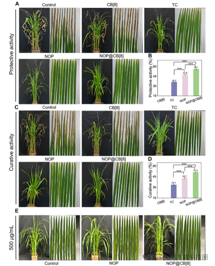 图6:NOP 及其超分子聚合物 NOP@CB[8] 在水稻细菌叶枯病防治中的体内疗效及安全性研究。(A、C)在连续培养 14 天后,使用 NOP、NOP@CB[8] 或商业杀菌剂 TC(200 µg ⋅mL− 1 )处理水稻叶片后的病害症状代表性图像。(B)基于(A)中所示的病斑严重程度对每种处理的保护效果进行定量评估。(C)从(B)中得出的 NOP、NOP@CB[8] 和 TC 的治愈效果定量评估。(D)在 500 µg mL− 1 浓度下,NOP 和 NOP@CB[8] 对水稻植株的药害评估。NOP 的浓度在自由分子和 NOP@CB[8] 中均为 200 µg mL− 1 ,后者中 NOP 与 CB[8] 的摩尔比为 1:1。数据以平均值±标准差(n ≥ 3)的形式呈现。统计学意义通过单因素方差分析得出,并随后进行了 LSD 后置检验(*p < 0.05,**p < 0.01,***p < 0.001;ns,无显著差异)。