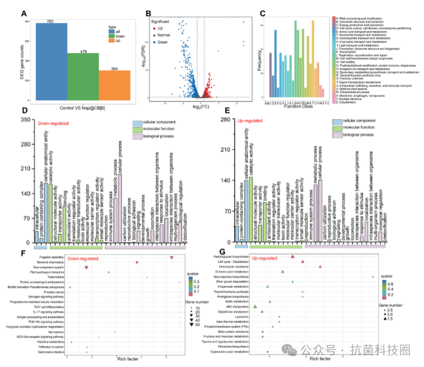 图4:对使用 NOP@CB[8] 在 2 倍 EC50 浓度下处理的 Xoo 组与未处理对照组进行转录组分析。(A)差异表达基因(DEG)统计概览。(B)火山图显示了 DEG 的分布情况。(C)基于(同源基因簇)分类对 DEG 的功能分类。(D、E)下调和上调的 DEG 的 GO 富集分析,以展示功能关联。(F、G)下调和上调的 DEG 的 KEGG 通路富集分析。