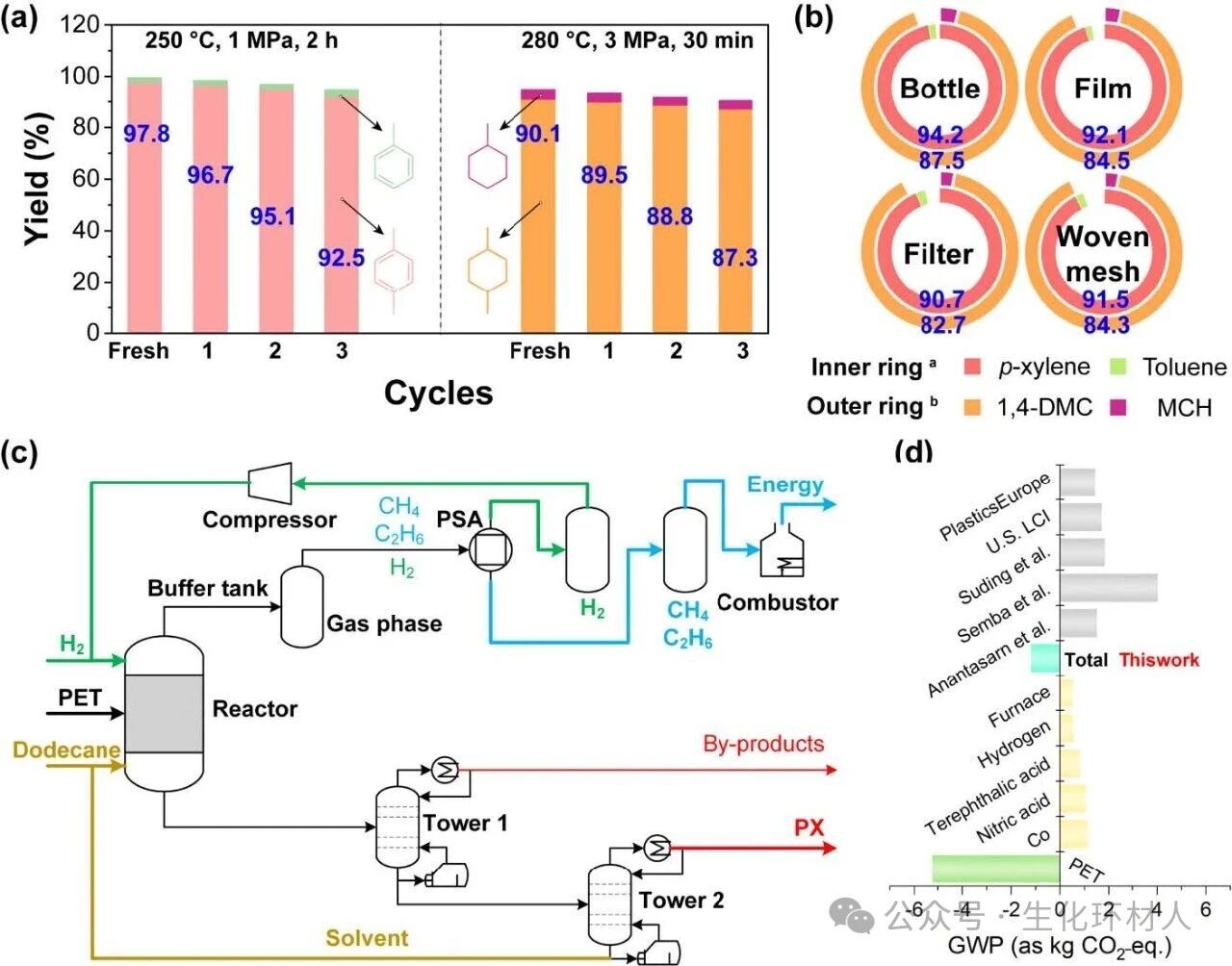 图6:催化剂的可重用性、PET商品的适用范围以及PET生产PX的LCA。a,Co/CoO-800催化剂在PET直接氢解为PX或1,4-DMC中的可重用性表现。b,各种PET商品直接氢解中的产物分布(内圈:250°C,1 MPa,3 h,相对于PET为10 mol%的Co(在Co/CoO-800中),3 mL正十二烷溶剂;外圈:280°C,3 MPa,1 h,相对于PET为10 mol%的Co(在Co/CoO-800中),3 mL正十二烷溶剂)。c,PET直接氢解制备PX的工艺流程。d,本工作及参考体系中GWP的主要贡献者。