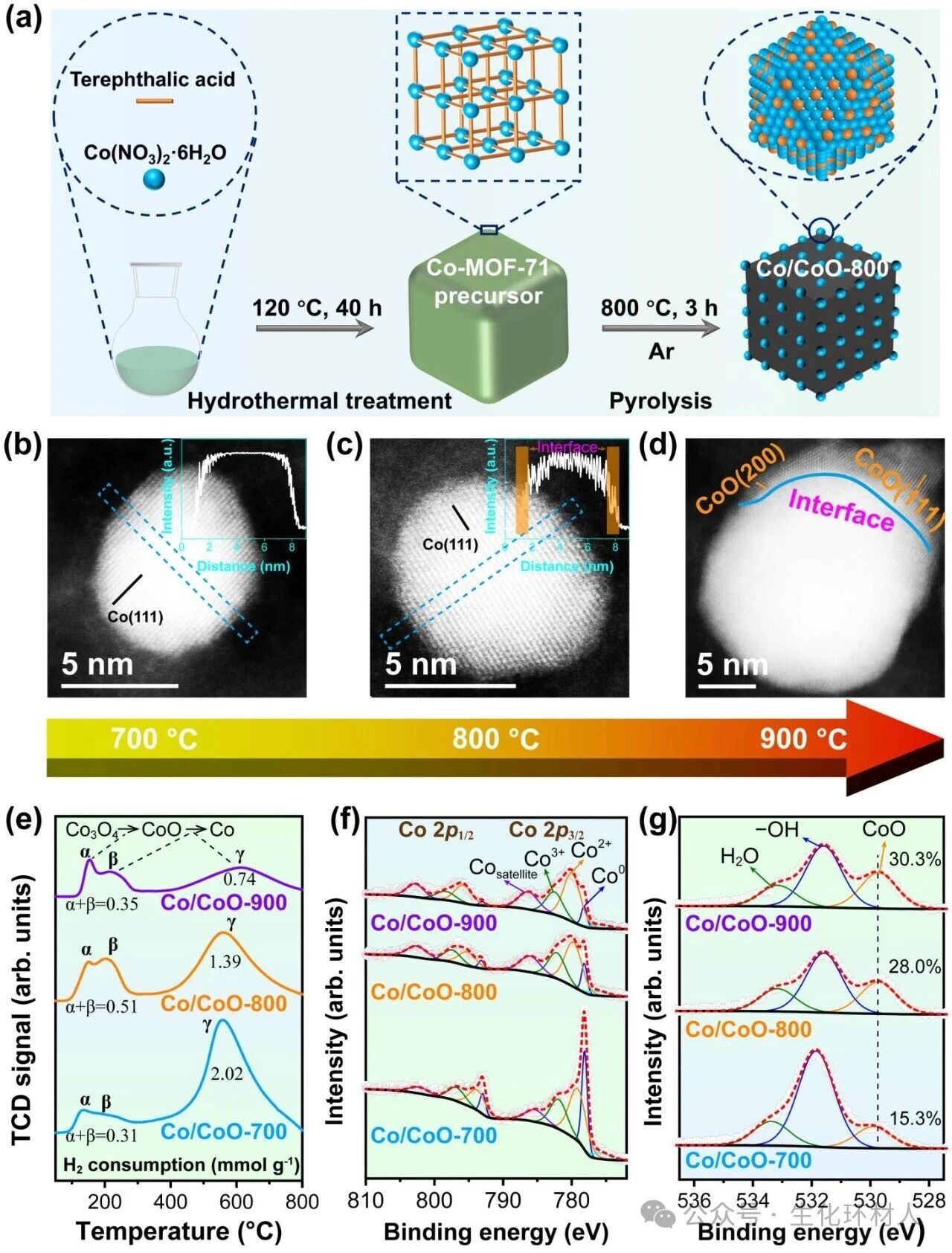 图2:Co/CoO界面的构建。a,Co/CoO-800催化剂合成示意图。b-d,(b) Co/CoO-700、(c) Co/CoO-800和(d) Co/CoO-900的AC-HAADF STEM图像(插图为蓝色虚线区域内的强度分布图)。e,Co/CoO-n的H₂-TPR曲线。f-g,Co/CoO-700、Co/CoO-800和Co/CoO-900的(f) Co 2p和(g) O 1s XPS谱图拟合结果。