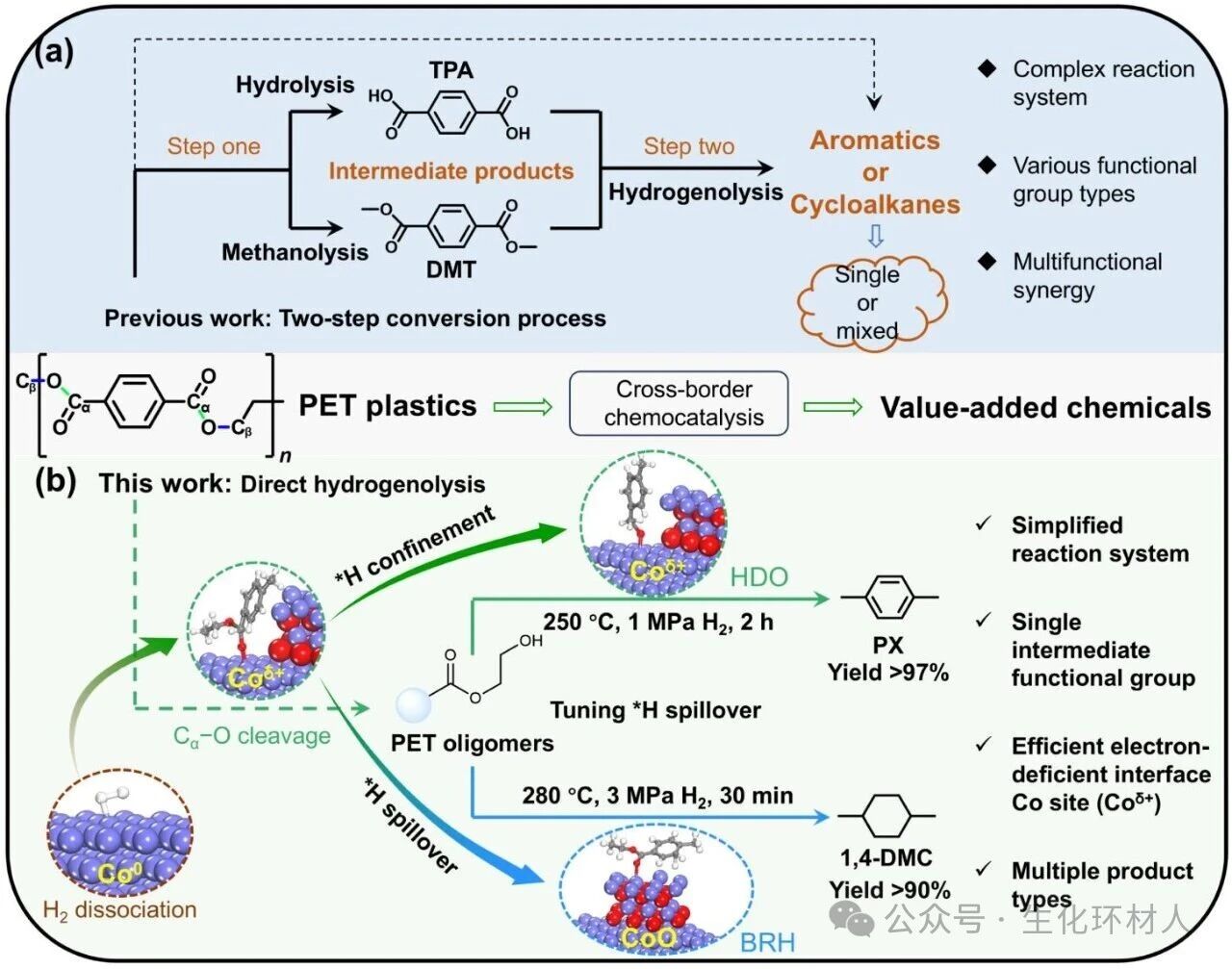 图1:通过(a)传统的两步法或(b)本文提出的直接氢解法将PET化学催化升级回收为高附加值化学品。TPA:对苯二甲酸;DMT:对苯二甲酸二甲酯;PX:对二甲苯;1,4-DMC:1,4-二甲基环己烷;HDO:加氢脱氧;BRH:苯环加氢。