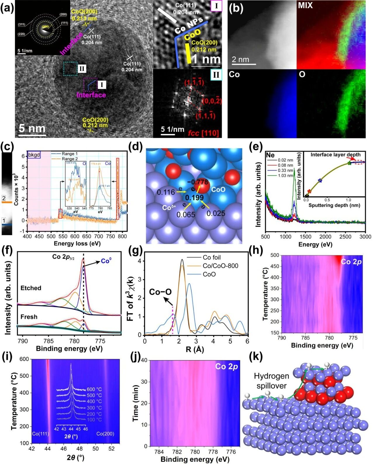 图3:Co/CoO-800的界面结构。a,HRTEM图像(插图为SAED)。b,EELS元素分布图。c,背景扣除后的空间分辨EELS能谱(插图为红色方框的放大图)。d,Co/CoO界面处Co和O原子的Bader电荷分析。e,不同溅射深度下Ne+ LEIS的Co谱(插图为归一化的Co信号强度及非线性拟合)。f,Ar⁺离子刻蚀前后的Co 2p₃/₂ XPS谱图。g,Co/CoO-800和参比样品的Co K-edge EXAFS谱图的傅里叶变换(未经相位校正)。h,0.5 mbar H₂条件下随温度变化的Co 2p NAP-XPS谱图。i,1 bar 10 vol% H₂/Ar气氛下随温度变化的原位XRD衍射图。j,0.5 mbar H₂、100 °C条件下随时间变化的Co 2p NAP-XPS谱图。k,氢从Co NPs溢流到CoO的示意图。