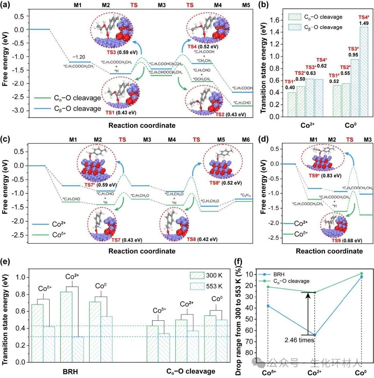 图5:反应机理的计算模拟。a,在Coᵟ⁺位点上对4-甲基苯甲酸乙酯的Cα-O和Cβ-O键断裂路径的DFT计算;插图为过渡态图像。b,在Co²⁺和Co⁰位点上断裂4-甲基苯甲酸乙酯的Cα-O和Cβ-O键所需的过渡态能垒。c,在Coᵟ⁺和Co²⁺位点上4-甲基苯甲醛HDO的反应路径;插图为过渡态结构。d,在Coᵟ⁺和Co²⁺位点上4-甲基苯甲酸乙酯BRH的反应路径;插图为过渡态结构。e,不同Co位点上BRH的过渡态能垒。f,在4-甲基苯甲酸乙酯的气-液相变温度上下,不同Co位点上BRH和Cα-O断裂的能量变化百分比。