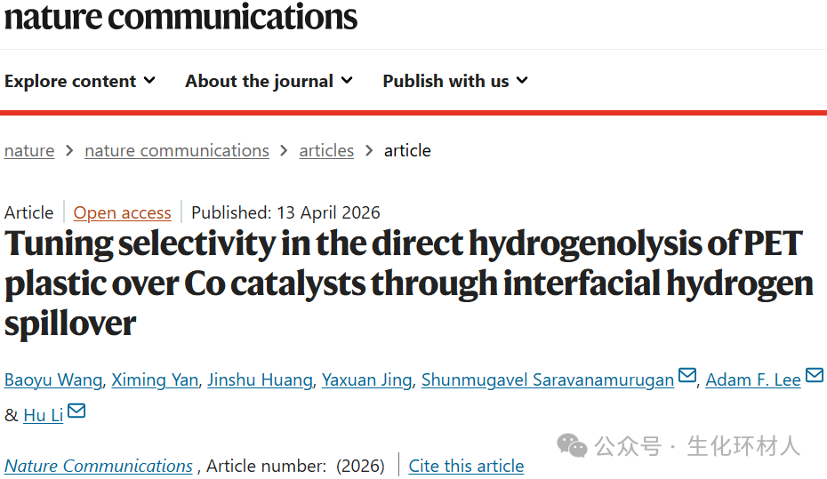 2026年04月13日,贵州大学李虎、贵州大学/北部湾大学王宝宇团队合作在Nature Communications期刊发表题为“Tuning selectivity in the direct hydrogenolysis of PET plastic over Co catalysts through interfacial hydrogen spillover”的研究论文,王宝宇为论文第一作者,李虎为论文通讯作者。