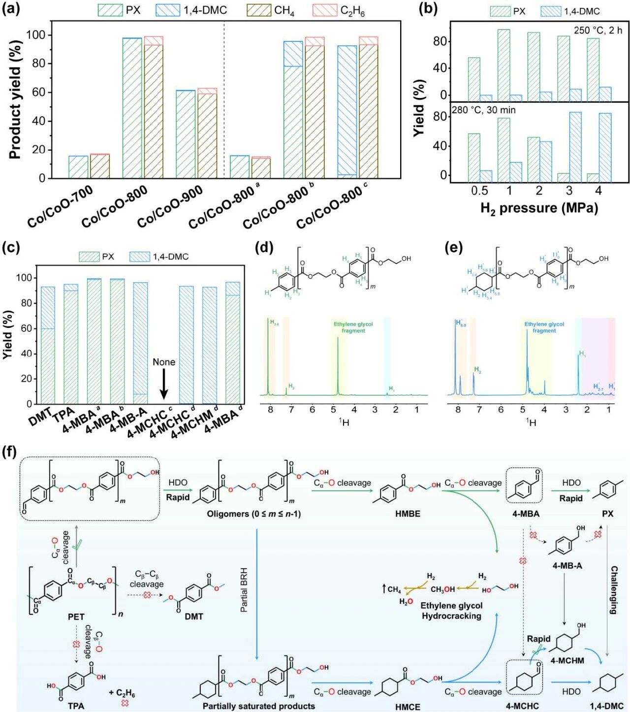 图4:活性测试和PET氢解路线。a,在不同反应条件下PET在Co催化剂上的直接氢解(250°C,1 MPa H₂,2 h;280°C,3 MPa H₂,30 min)。b,H₂压力对液体产物收率的影响。c,不同底物;反应条件:相对于底物10 mol%的Co(在Co/CoO-800中),3 mL正十二烷,250°C,1 MPa H₂,2 h(a0 min:即加热至250°C后迅速冷却,不搅拌;b1 h:220°C下1 h;c:220°C下1 h,然后280°C、3 MPa H₂下5 min)。d,e,在(d) 250°C、1 MPa H₂下反应30 min后和(e) 280°C、3 MPa H₂下反应5 min后所得PET低聚物的¹H NMR谱图。f,PET氢解中的反应路径。DMT:对苯二甲酸二甲酯,TPA:对苯二甲酸,4-MBA:4-甲基苯甲醛,4-MB-A:4-甲基苯甲醇,4-MCHC:4-甲基环己烷-1-甲醛,4-MCHM:4-甲基-1-环己烷甲醇,BRH:苯环加氢,HDO:加氢脱氧。