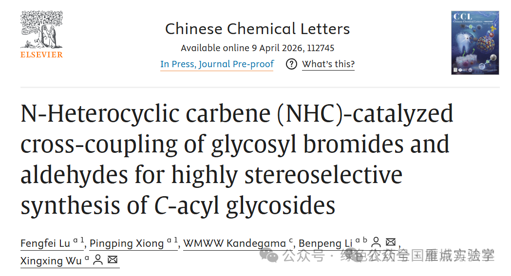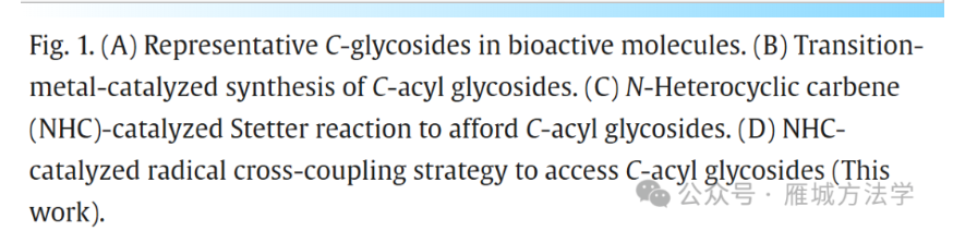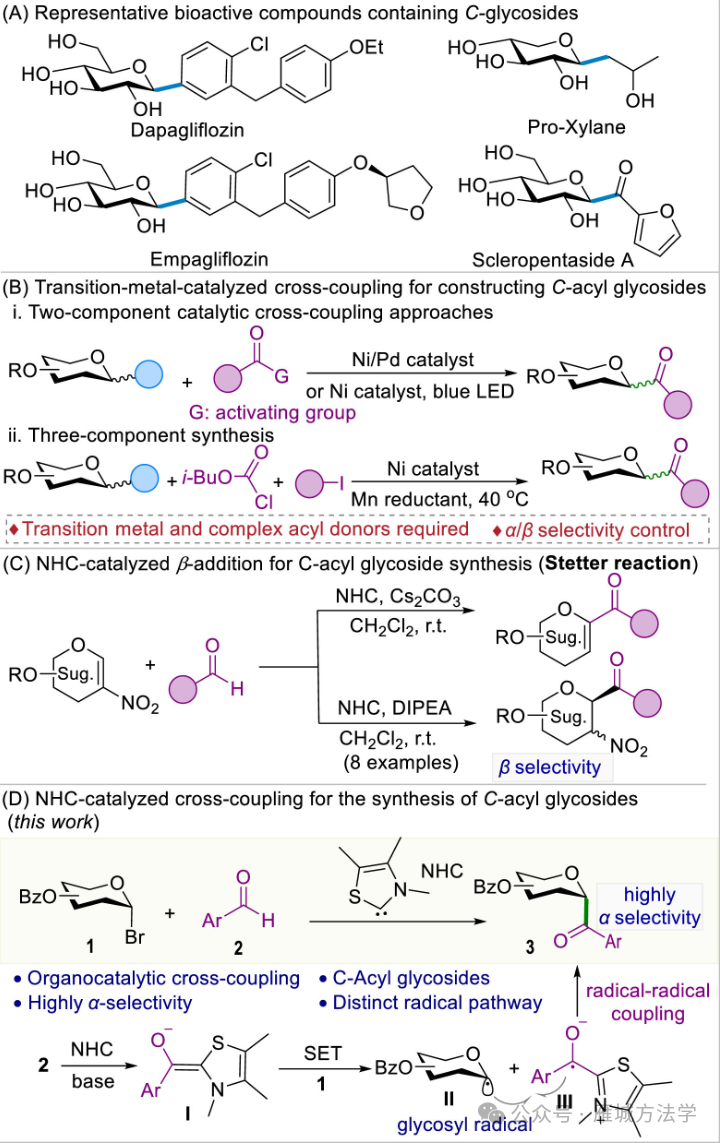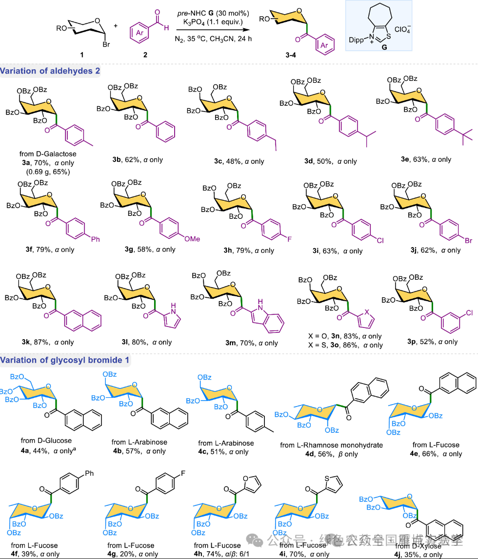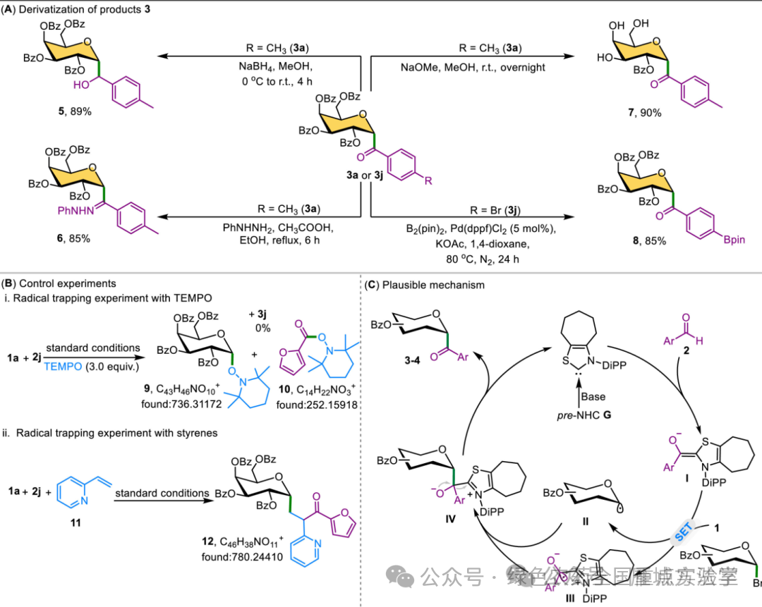 In summary, we have developed an N-heterocyclic carbene organocatalytic cross-coupling strategy that enables the direct construction of C-acyl glycosides through the straightforward assembly of readily available glycosyl bromides with simple aldehydes. This organocatalytic strategy provides a concise alternative to transition-metal-mediated C-acyl glycosylation and avoid the use of preactivated acyl donors such as anhydrides or thioesters, offering broad substrate generality and excellent diastereocontrol. Mechanistic studies support a radical manifold in which NHC-promoted single-electron transfer from glycosyl bromides generates glycosyl radicals that subsequently engage aldehyde-derived ketyl radical intermediates to forge the C–C bond at the anomeric center, delivering the C-acyl glycosides as single stereoisomers.The C-acyl glycosides accessed herein serve as versatile synthetic linchpins for further diversification toward structurally complex and biologically relevant C-glycoside architectures. Ongoing efforts in our laboratory focus on expanding NHC-enabled radical processes for carbohydrate functionalization and exploring the application of these robust C-glycoside scaffolds in agrochemical discovery.