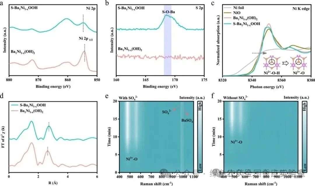 图 2 | 活性相的鉴定。(a) Ba₁Ni₁₋ₓ(OH)₂和S-Ba₁Ni₁₋ₓOOH的Ni 2p XPS谱图和(b) S 2p XPS谱图。(c) Ni箔、NiO、Ba₁Ni₁₋ₓ(OH)₂和S-Ba₁Ni₁₋ₓOOH的Ni K边XANES谱图。(d) Ba₁Ni₁₋ₓ(OH)₂和S-Ba₁Ni₁₋ₓOOH的傅里叶变换EXAFS谱图。在KOH电解液中(e)含有SO₄²⁻和(f)不含SO₄²⁻时,Ba₁Ni₁₋ₓ(OH)₂在1.4 VRHE下的时间依赖拉曼光谱