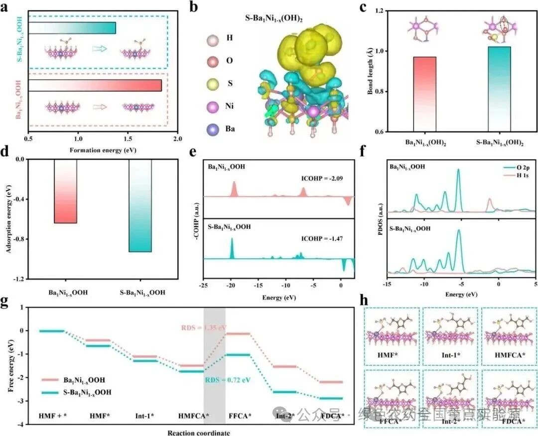 图 5 | DFT计算。(a) S-Ba₁Ni₁₋ₓOOH和Ba₁Ni₁₋ₓOOH的形成能。(b) S-Ba₁Ni₁₋ₓ(OH)₂的电荷密度差图。(c) S-Ba₁Ni₁₋ₓ(OH)₂和Ba₁Ni₁₋ₓ(OH)₂中O—H的键长。(d) HMF在S-Ba₁Ni₁₋ₓOOH和Ba₁Ni₁₋ₓOOH上的吸附能。(e) HMF中O—H的COHP分析和(f) DOS分析。(g) HMF在S-Ba₁Ni₁₋ₓOOH和Ba₁Ni₁₋ₓOOH上氧化为FDCA的吉布斯自由能曲线。(h) HMF在S-Ba₁Ni₁₋ₓOOH上氧化为FDCA的模型演化过程