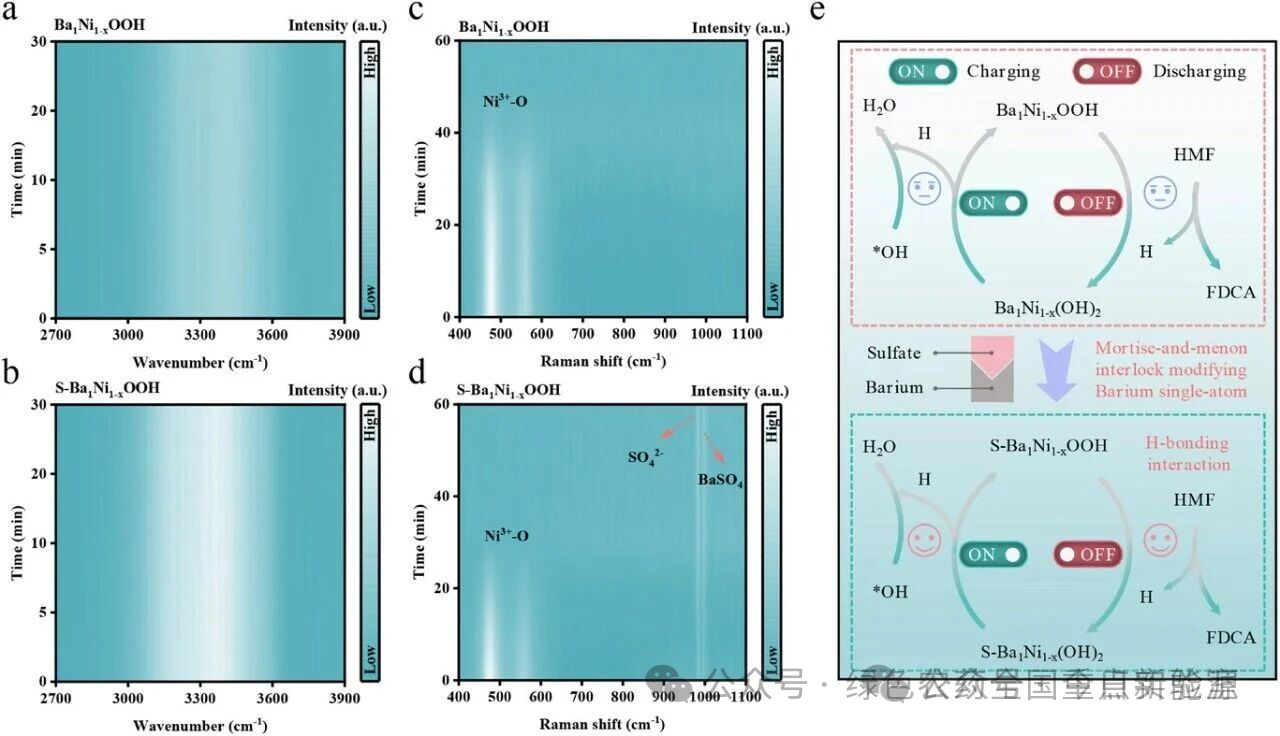 图 4 | HMF氧化的机理研究。使用(a) Ba₁Ni₁₋ₓOOH和(b) S-Ba₁Ni₁₋ₓOOH催化剂在HMF氧化过程中的时间依赖原位ATR-IR光谱。使用(c) Ba₁Ni₁₋ₓOOH和(d) S-Ba₁Ni₁₋ₓOOH催化剂在HMF氧化过程中的时间依赖拉曼光谱。(e) Ba₁Ni₁₋ₓOOH和S-Ba₁Ni₁₋ₓOOH催化剂催化HMF氧化为FDCA的示意图。