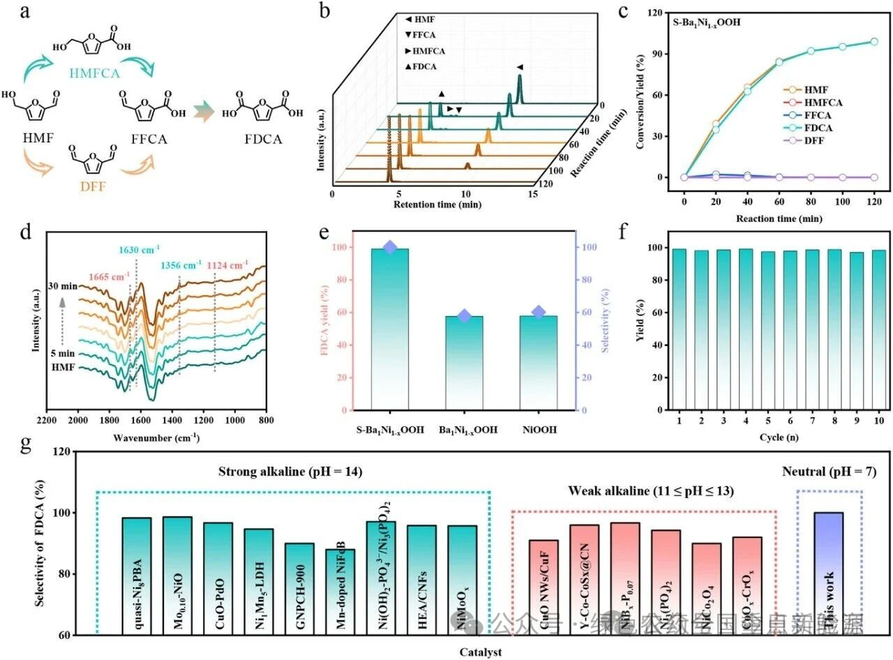 图 3 | HMFOR性能研究。(a) HMF氧化为FDCA的反应路径。(b) S-Ba₁Ni₁₋ₓOOH催化HMF(5 mM, 2 mL)氧化的HPLC谱图。(c) 不同时间下S-Ba₁Ni₁₋ₓOOH催化HMF(5 mM, 2 mL)氧化中FDCA的产率和转化率。(d) S-Ba₁Ni₁₋ₓOOH上HMF氧化的时间依赖原位ATR-IR光谱。(e) 不同催化剂(负载量:6 mg)在HMF(5 mM, 2 mL)氧化120 min后FDCA的产率和选择性。(f) 连续多次HMF氧化中的FDCA产率。(g) S-Ba₁Ni₁₋ₓOOH在HMF氧化中的FDCA选择性与本工作之前报道的催化剂的比较