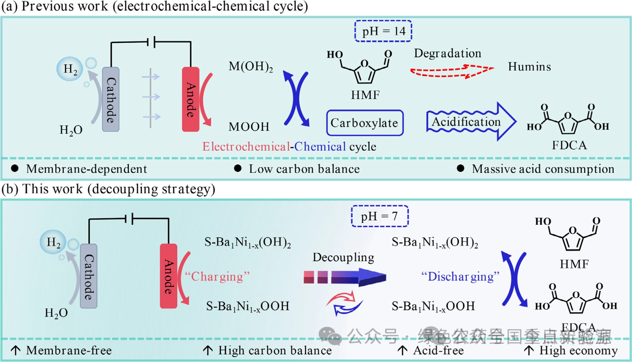 示意图1 | 通过(a)电化学-化学循环(前期工作)和(b)解耦策略(本工作)将HMF电氧化为FDCA的示意图