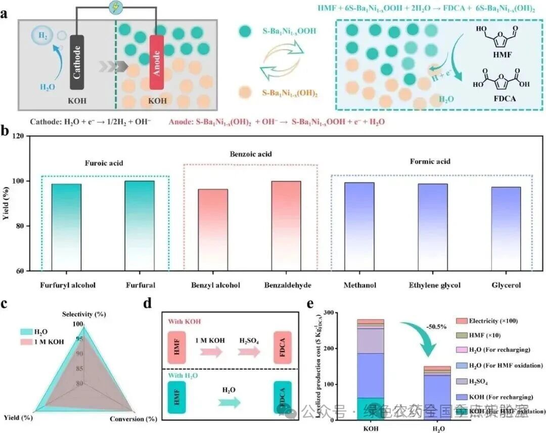 该研究将单原子Ba锚定到羟基氧化镍中作为硫酸根(榫头)的卯眼,构建了一种可充电阳极S-Ba₁Ni₁₋ₓOOH,用于解耦HMF电氧化,从而在无碱、无外加电位和无膜条件下实现2,5-呋喃二甲酸(FDCA)的定量生产。该解耦系统包括:(i) 通过充电实现活性Ni³⁺—O的(再)生成,以及 (ii) 在纯水中无电(放电)条件下,用Ni³⁺—O提取HMF的H原子,通过去质子化生成FDCA(转化率和选择性接近100%)。表面硫酸根与HMF的羟基之间的氢键相互作用可以加速底物向固-液界面的迁移,从而提高转化率。理论计算阐明,氢键相互作用降低了HMF中O—H键的O-2p与H-1s轨道之间的杂化程度,从而提高了其H的脱除能力,进而促进HMF完全氧化为FDCA。多种生物质衍生物也适用于该解耦系统,以>96.3%的产率得到相应的酸。技术经济分析表明,用纯水替代强碱可以将FDCA的生产成本降低50.5%,凸显了该解耦策略的广阔前景,并为生物质高值化提供了一条有吸引力的途径。