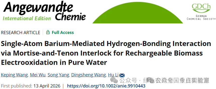 2026年04月13日,贵州大学李虎团队在Angewandte Chemie International Edition期刊发表题为“Single-Atom Barium-Mediated Hydrogen-Bonding Interaction via Mortise-and-Tenon Interlock for Rechargeable Biomass Electrooxidation in Pure Water”的研究论文,团队成员王柯平为论文第一作者,李虎为论文通讯作者