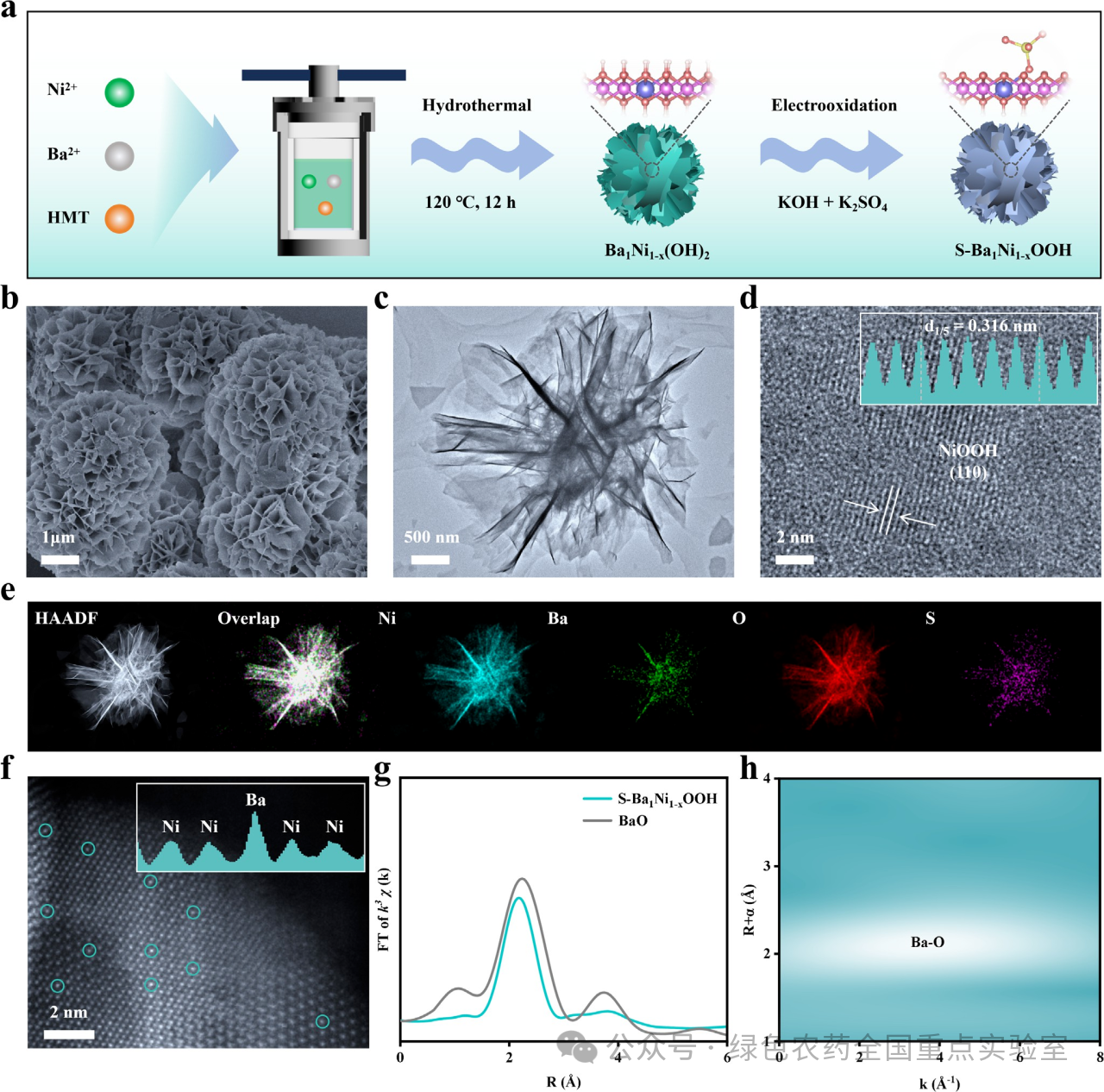 图 1 | 催化剂的合成与表征。(a) 制备S-Ba₁Ni₁₋ₓOOH催化剂的示意图。(b) S-Ba₁Ni₁₋ₓOOH催化剂的SEM图像,(c) TEM图像,(d) 高分辨TEM图像,以及(e) 相应的元素分布图。(f) S-Ba₁Ni₁₋ₓOOH催化剂的AC HAADF-STEM图像(插图:强度分布图)。(g) S-Ba₁Ni₁₋ₓOOH催化剂和BaO参比样品的Ba L边傅里叶变换EXAFS谱图。(h) S-Ba₁Ni₁₋ₓOOH催化剂的小波变换EXAFS信号