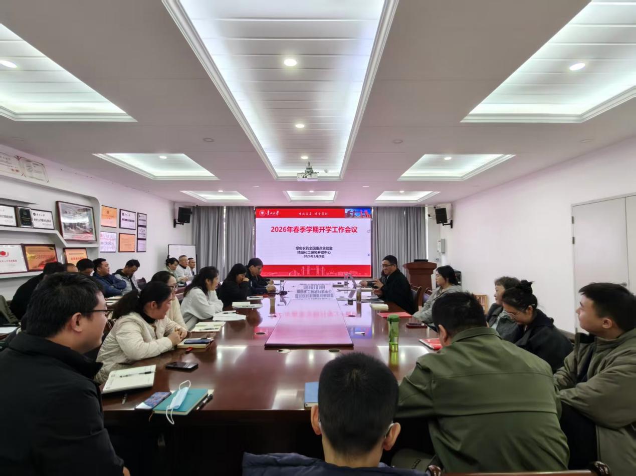 2026年2月28日,春启新程,奋楫争先。为全面贯彻落实学校2026年春季学期开学工作会议部署,进一步统一思想、凝聚共识、明确任务,贵州大学精细化工研究开发中心(绿色农药全国重点实验室)召开新学期工作会议。中心党委书记张林,副主任李向阳、陈卓、臧连生,副处级组织员杨凌及全体教师参加会议。