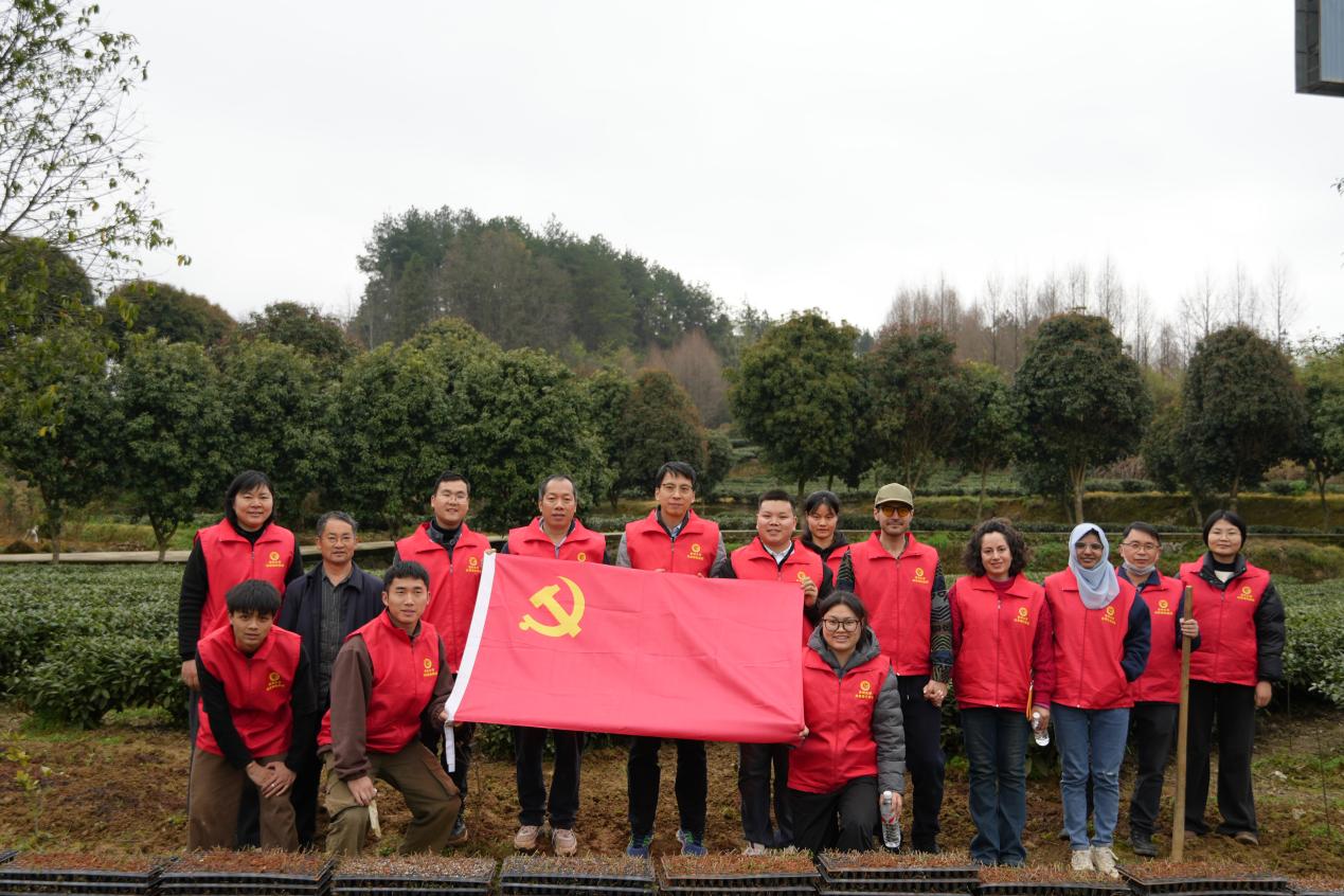 阳春三月,万物勃发。3月21日,在遵义市湄潭县西河镇抹茶茶园基地里,一面鲜红的党旗在春风中猎猎作响,旋耕机的轰鸣声与师生们的欢笑声交织成一曲春耕交响乐。绿色农药全国重点实验室(贵州大学精细化工研究开发中心)教工党支部联合研究生第二、第五党支部将主题党日活动搬到田间地头,组织党员教师带领留学生、研究生与当地茶农一起,开展“姬岩垂草”种植活动,在春耕一线书写“党建+生态+产业”的生动实践。
