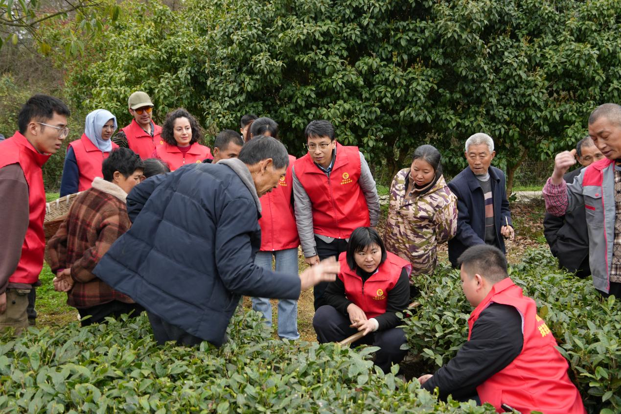 “姬岩垂草是一种匍匐生长的多年生草本植物,长势强、覆盖快、竞争能力强,能有效抑制杂草生长,且耐旱耐瘠,不争茶肥,是茶园生态控草的理想选择。”活动现场,精化中心教师一边示范种植,一边向留学生和研究生讲解“以草治草”的生态原理。这种不用除草剂、靠植物竞争实现杂草防治的模式,引得留学生们连连赞叹,纷纷拿起手机记录下这堂别开生面的“田间课堂”。